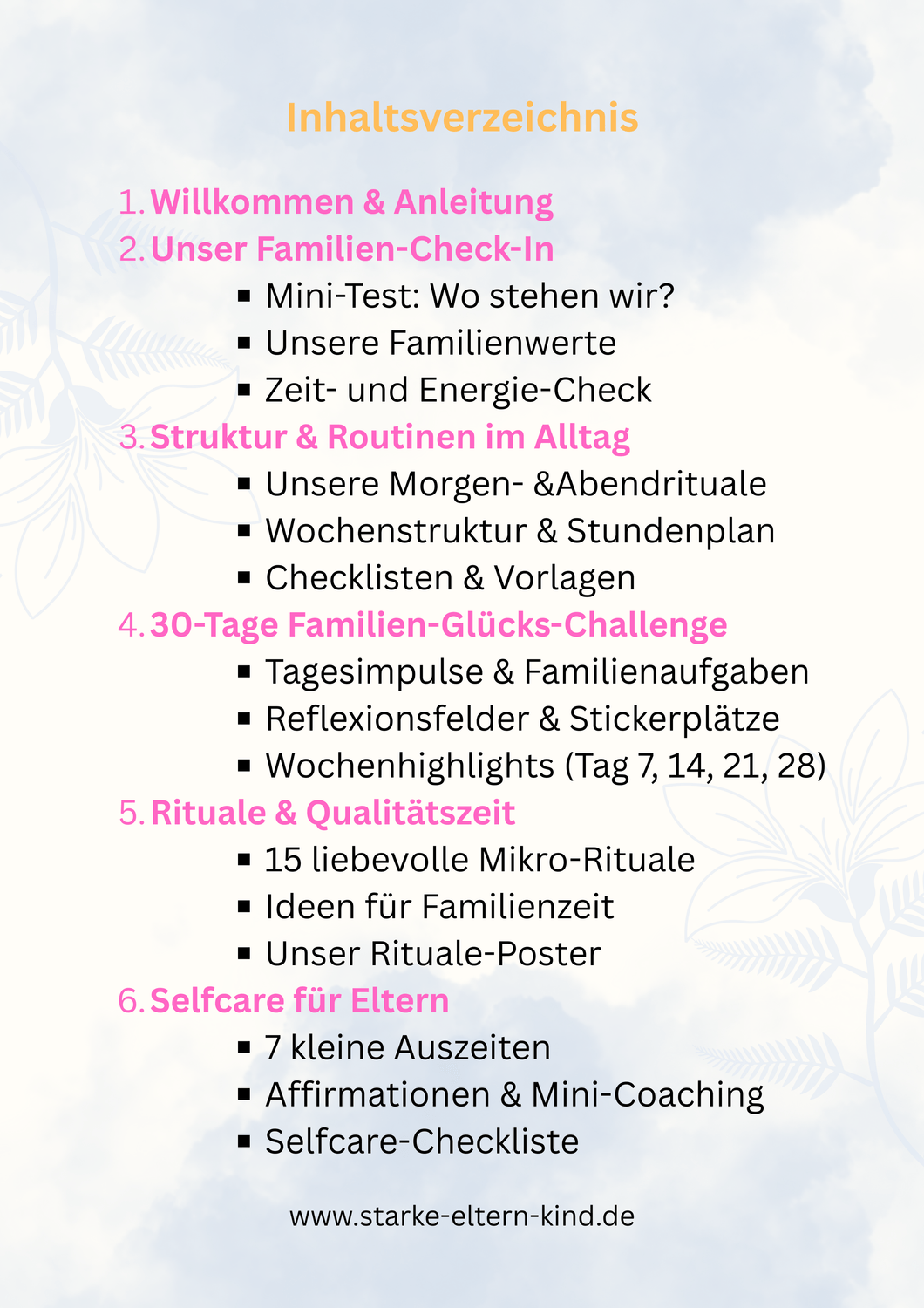 Der Familien-Glücksplaner ist dein liebevoller Begleiter für 30 Tage. Mit liebevollen Tagesimpulsen, kleinen Ritualen, klaren Strukturen und stärkenden Reflexionsfragen bringt der Planer mehr Leichtigkeit und Freude in euren Alltag.