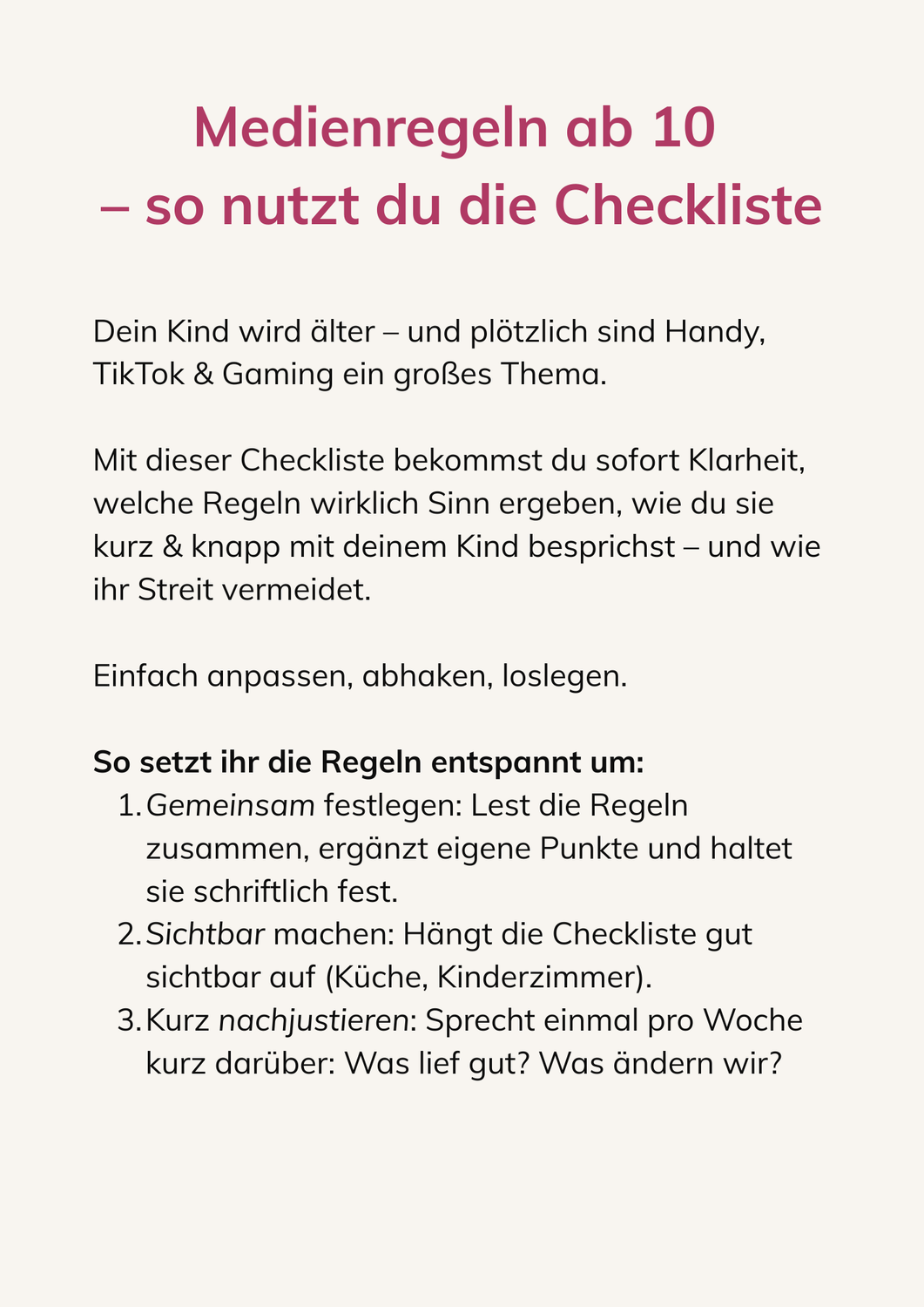Mit dieser Checkliste hast du sofort anwendbare Regeln für dein Kind (ab ca. 10 Jahren) – einfach, klar, familienfreundlich.