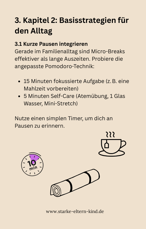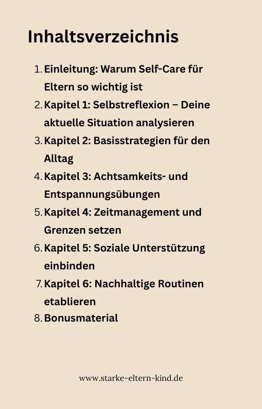 „Self-Care für Eltern“ ist dein persönlicher Begleiter, um dich selbst nicht aus den Augen zu verlieren. Mit einfachen, umsetzbaren Übungen, inspirierenden Impulsen und alltagstauglichen Routinen hilft es dir, Kraft zu tanken, Stress abzubauen und dich wieder mit neuer Energie deinen Kindern und deinem Alltag zuzuwenden.